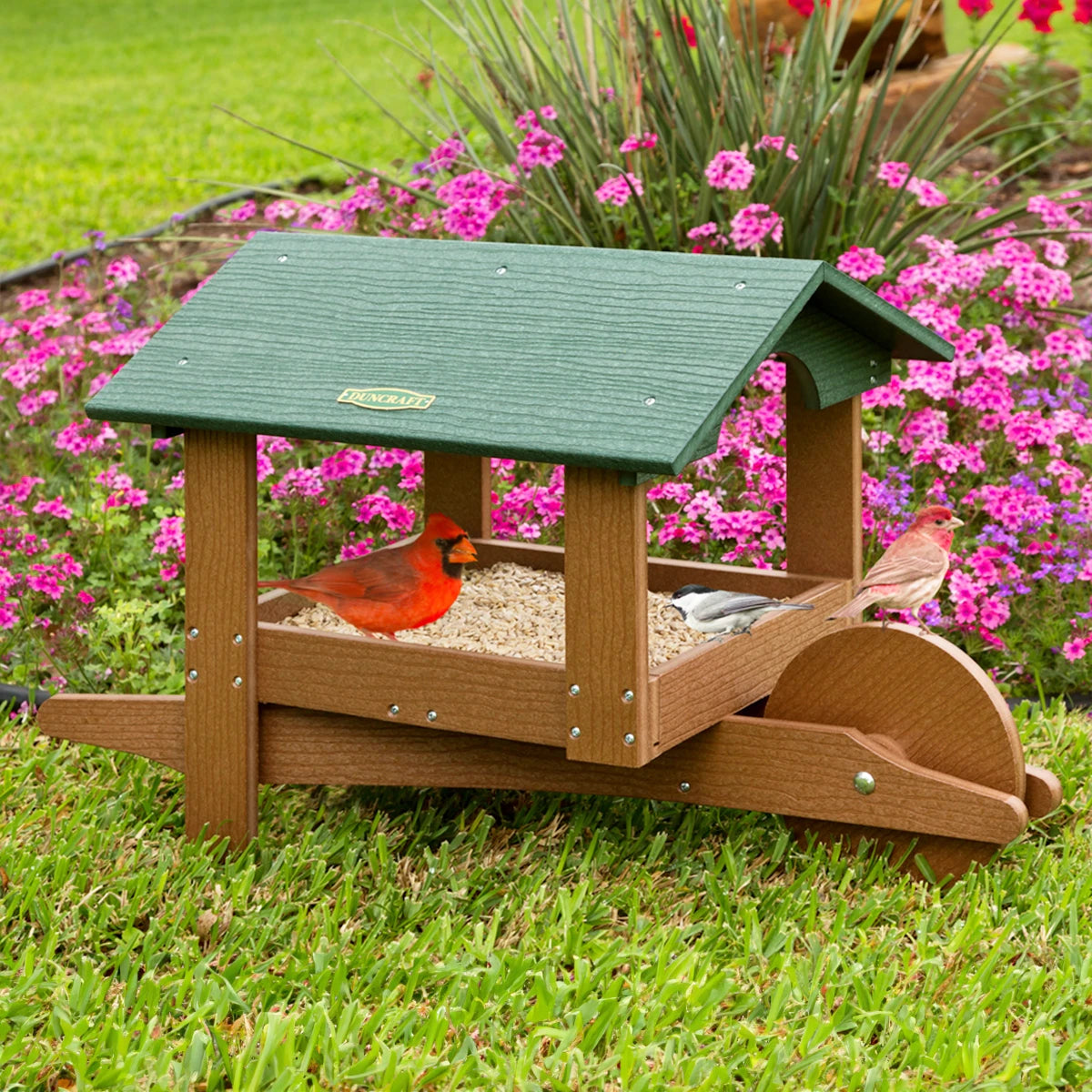 Attract birds with our charming garden cart. Watch your birds perch around all four sides of this decorative, sturdy and easy to use platform feeder. The overhanging roof keeps the seed dry for your birds in wet weather. Great for year-round feeding! Looks great as a yard or garden accent and may be moved when mowing the lawn. Durable brown and green recycled plastic and engineered for rust-free drainage. The garden cart measures 26-3/4 x 14 x 16-3/8 inches tall overall.