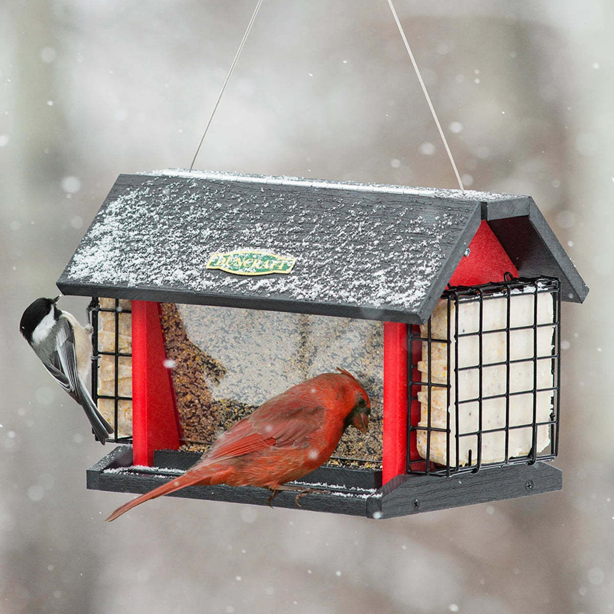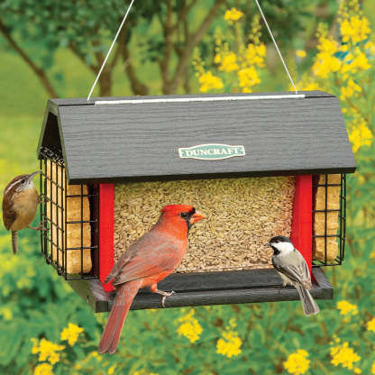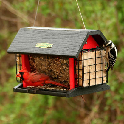 Attract a variety of perching and clinging birds to your feeder. We love this traditional red barn hopper feeder for attracting more birds with feeding from all four sides! Watch cardinals perch and feed from the two seed trays, while woodpeckers cling and feed on suet. The hopper in the center protects the seed from wet weather, great for year-round feeding. Includes cable hanger with built-in perches along the bottom. Lift up the roof for filling with seed from the top. Durable black and red recycled plastic. 12 x 8 x 8-1/4 inches tall overall.