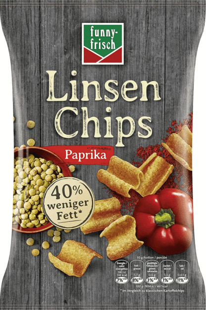 funny-frisch Lentil Chips, a crunchy munching fun made from lentils with spicy paprika and for the calorie-conscious with 40% less fat than conventional potato chips, deliciously crispy baked in pure sunflower oil. Vegan, Vegetarian. Without artificial flavor enhancers, artificial flavors or artificial colors.