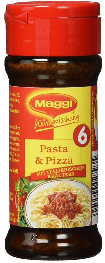 The Maggi seasoning mix for pasta and pizza combines typical Italian herbs and spices for the optimal taste experience. It is not only suitable for refining pizza and pasta, but also for seasoning a homemade minestrone, for seasoning a fresh tomato salad or for preparing a delicious Bolognese sauce. Typical Italian herbs such as oregano, thyme, basil, bay leaf, sage and rosemary round off the taste of the dishes perfectly.