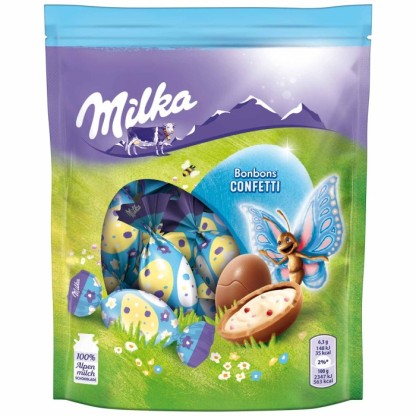 Colorful in the Easter nest. With Milka Bonbons Confetti Easter can rise at Easter the party in the mouth. The bite-sized balls of delicious alpine milk chocolate are filled with a delicate milk cream containing colorful drag�� pearls that provide a unique crunch effect when snacking.
