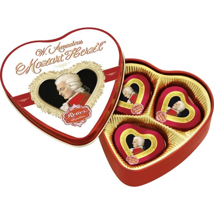 The classic from Reber in heart shape here in the especially beautiful gift packaging as a heart tin, perfect for Valentine's Day and Mother's Day, but also otherwise a gift that comes from the heart. 3 individually wrapped heart-shaped chocolates, filled with pistachio marzipan made from fresh green pistachios, almonds and hazelnut nougat, coated with fine pralin�� dark chocolate: these are real Reber Mozart balls in heart shape.